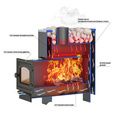 Дровяная печь для бани Везувий Русичъ предназначена для отопления парильного помещения бани или сауны, получения пара и нагрева воды. Максимальная площадь отапливаемого помещения 24 м3. Изготовлена из особо прочной котловой стали марки 09Г2С 6-8мм. Дверца для печи из чугуна. Выносной топливный канал помогает растапливать печь, находясь в предбаннике, благодаря этому в парной сохраняется чистота. Так же можно следить за огнем, не проходя в одежде в натопленное помещение. Открытая каменка вмещает до 40 кг камней, позволяя равномерно распределить температуру в парной. К печи необходимо подключить дымоход диаметром 115 мм.