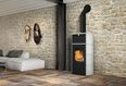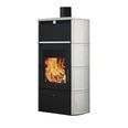 Печь на дровах, выполнена из стали, облицовка из керамики, а топочная камера из огнеупорного материала scamolex. Широкое стекло позволяет любоваться красотой пламени. Дымоход имеет верхнее подключение.
