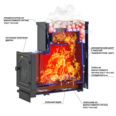 • Объемная вентилируемая каменка вмещает до 60 кг банного камня и нагревает его до 400 °С. При попадании воды генерируется большое количество мелкодисперсного лёгкого пара.